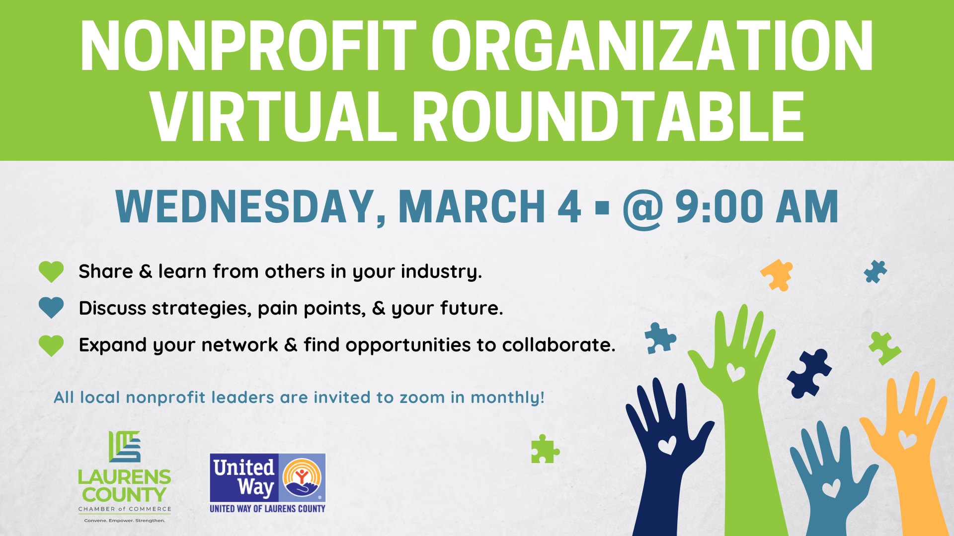 Join us for our next nonprofit-focused discussion as we open the lines of communication, build connections, and explore opportunities to collaborate. Please register in advance at https://us02web.zoom.us/meeting/register/lRhcuZAeRQyh8cHjjq5Vhw.Images
