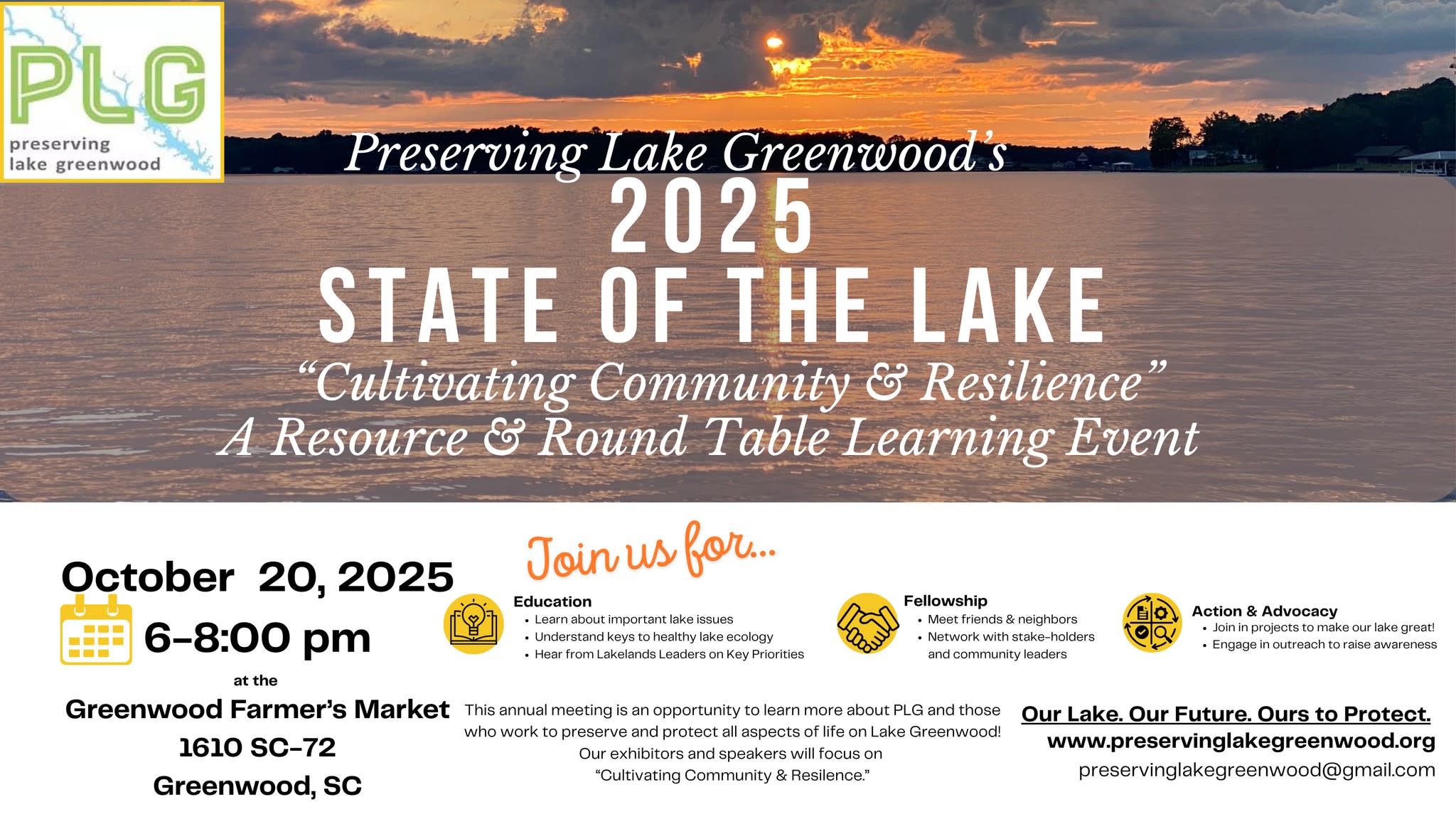 on behalf of Preserving Lake Greenwood, I’d like to invite your organization to participate as an exhibitor at our annual State of the Lake community meeting: