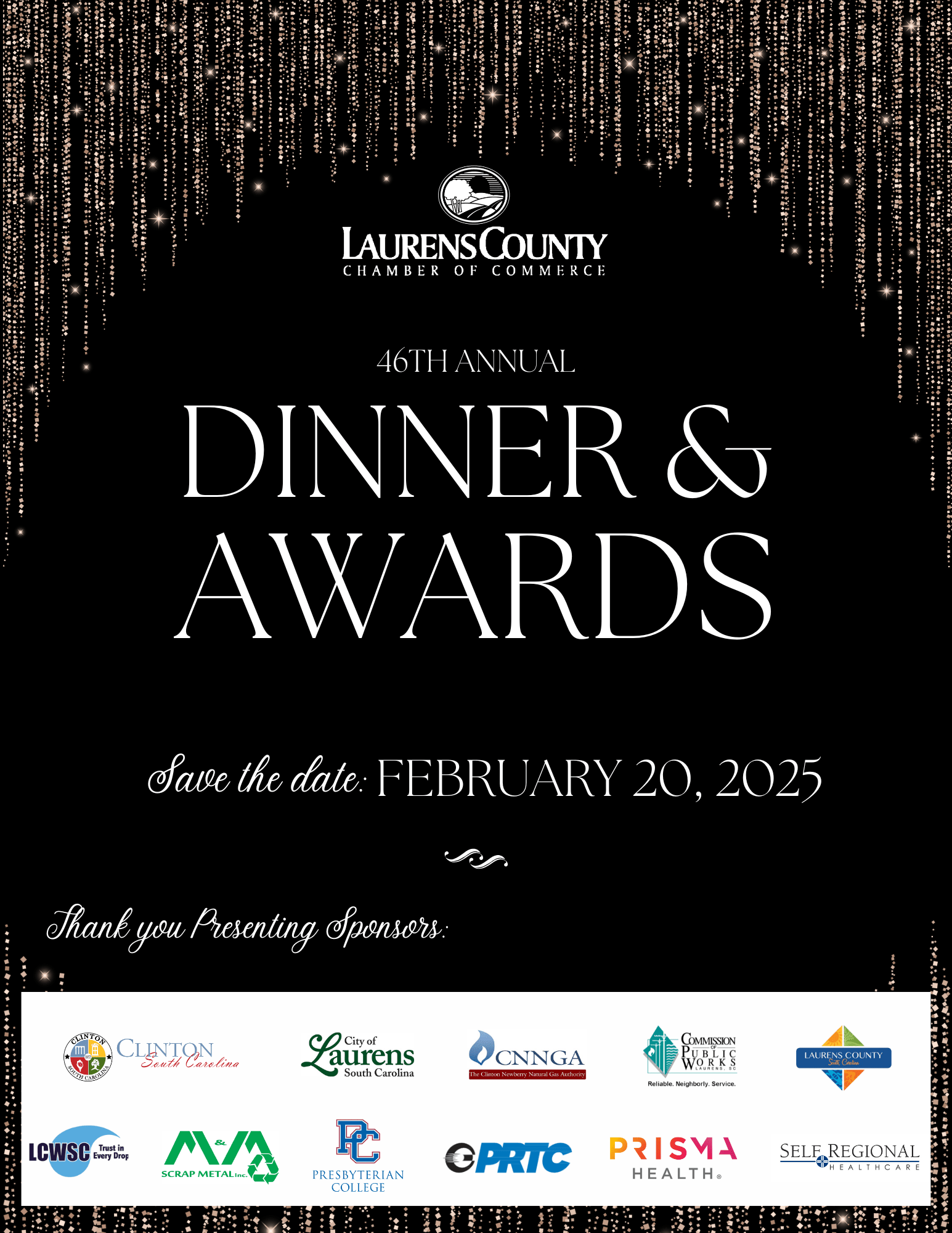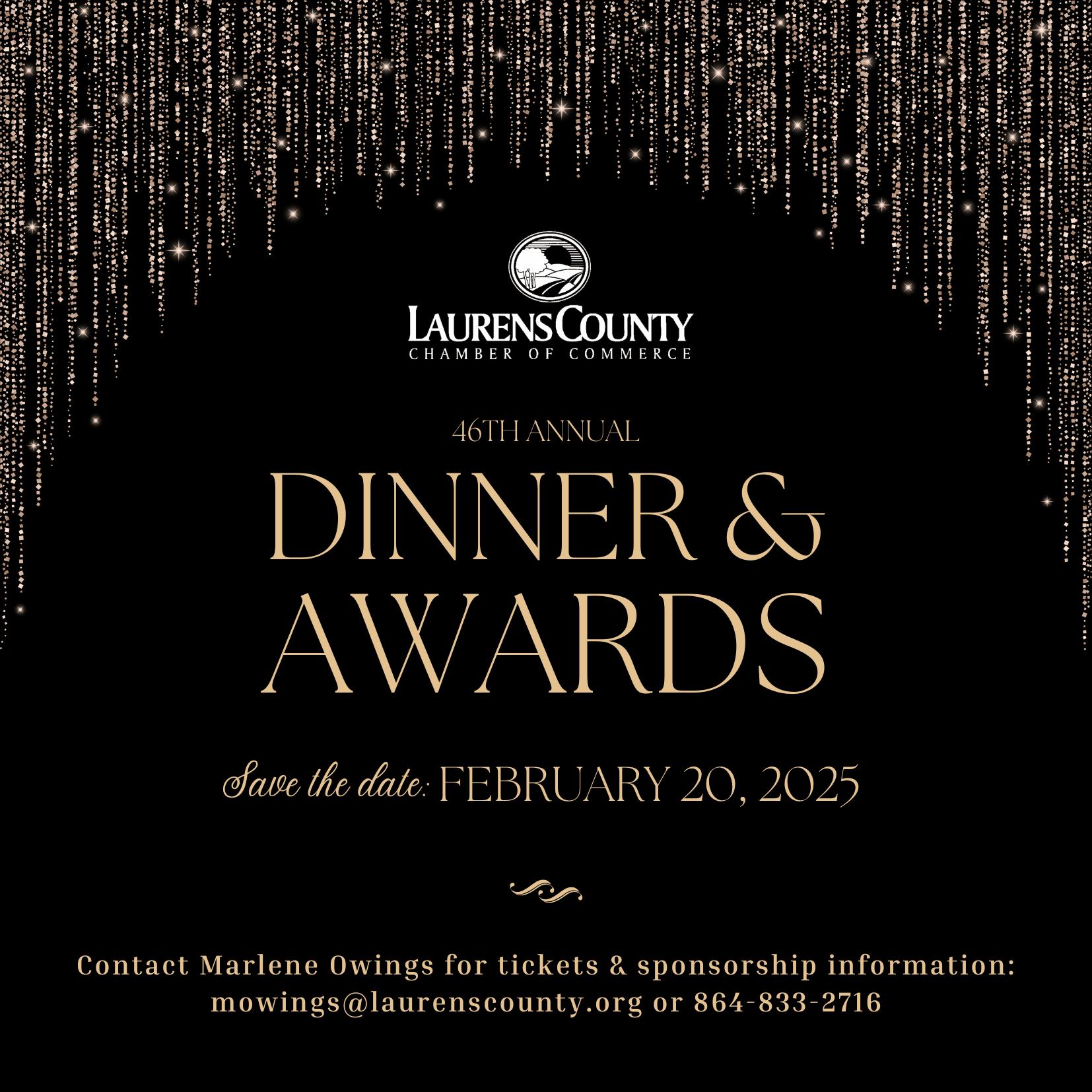 The Chamber invites the community to the Annual Dinner and Awards. The annual accomplishments are highlighted along with our dedicated sponsors, volunteers, and community members. Many successful businesses, organizations, and individual leaders in the community will be honored during the awards ceremony for their commitment and support of Laurens County.