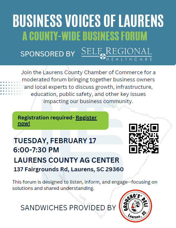 A County-Wide Business Forum- Join the Laurens County Chamber of Commerce for a moderated forum bringing together business owners and local experts to discuss growth, infrastructure, education, public safety, and other key issues impacting our business community. Registration is required. Register now at: https://www.surveymonkey.com/r/QSL3J23