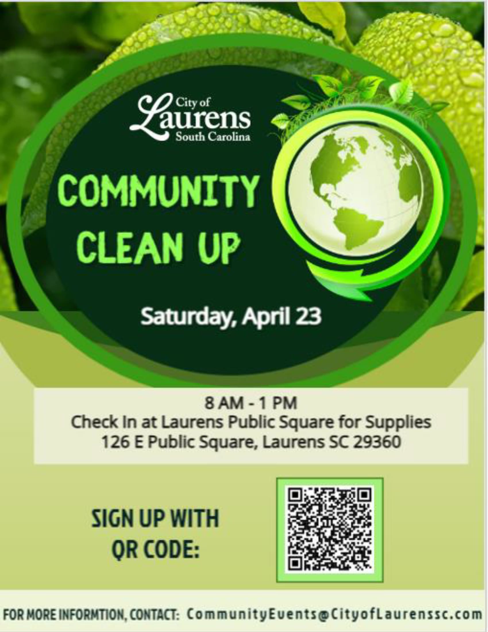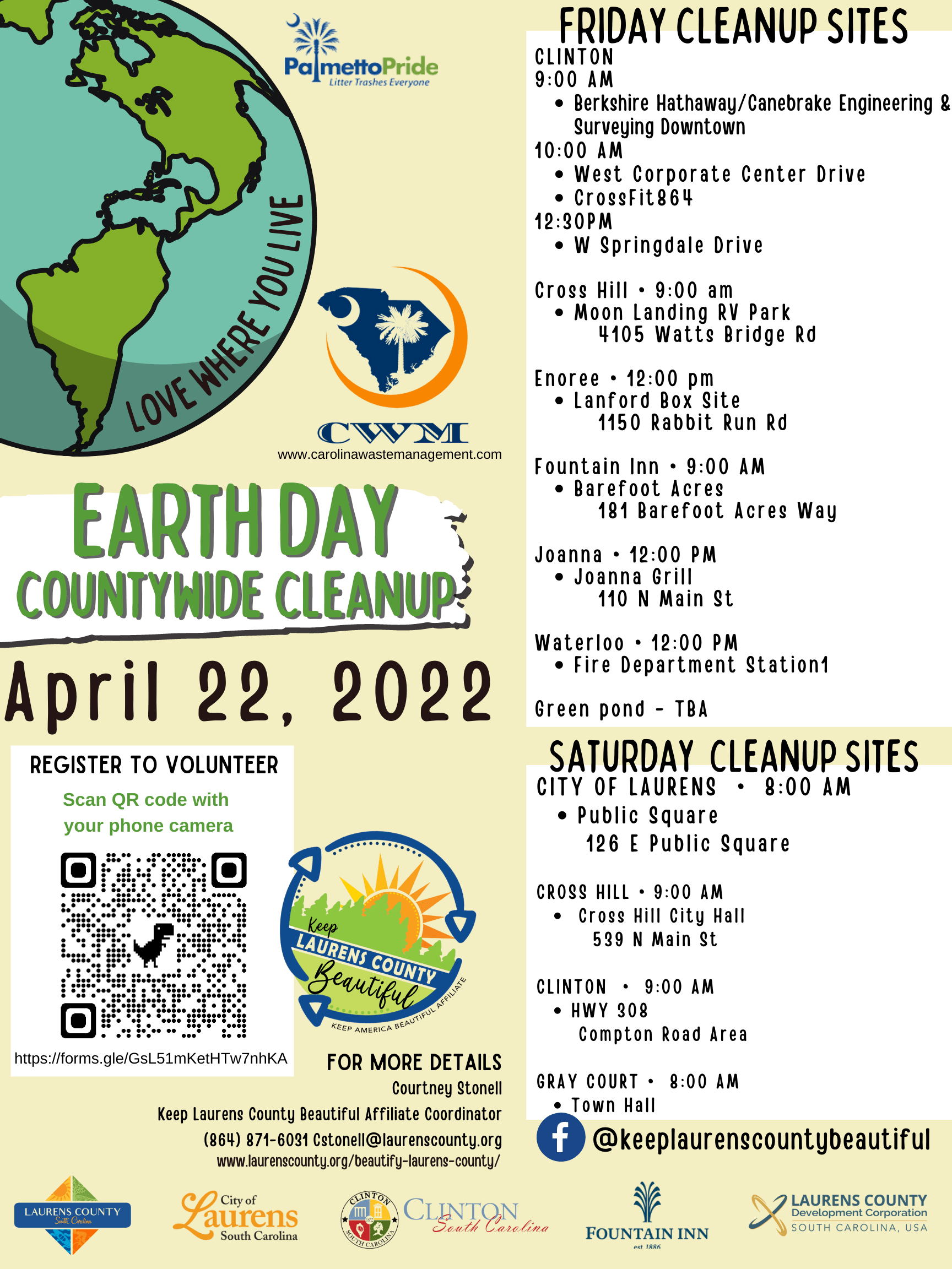 🌎 April is Earth Month, and April 22nd is Earth Day. 🌎 There will be Cleanup Sites all over Laurens County on April 22nd and continuing through Saturday.