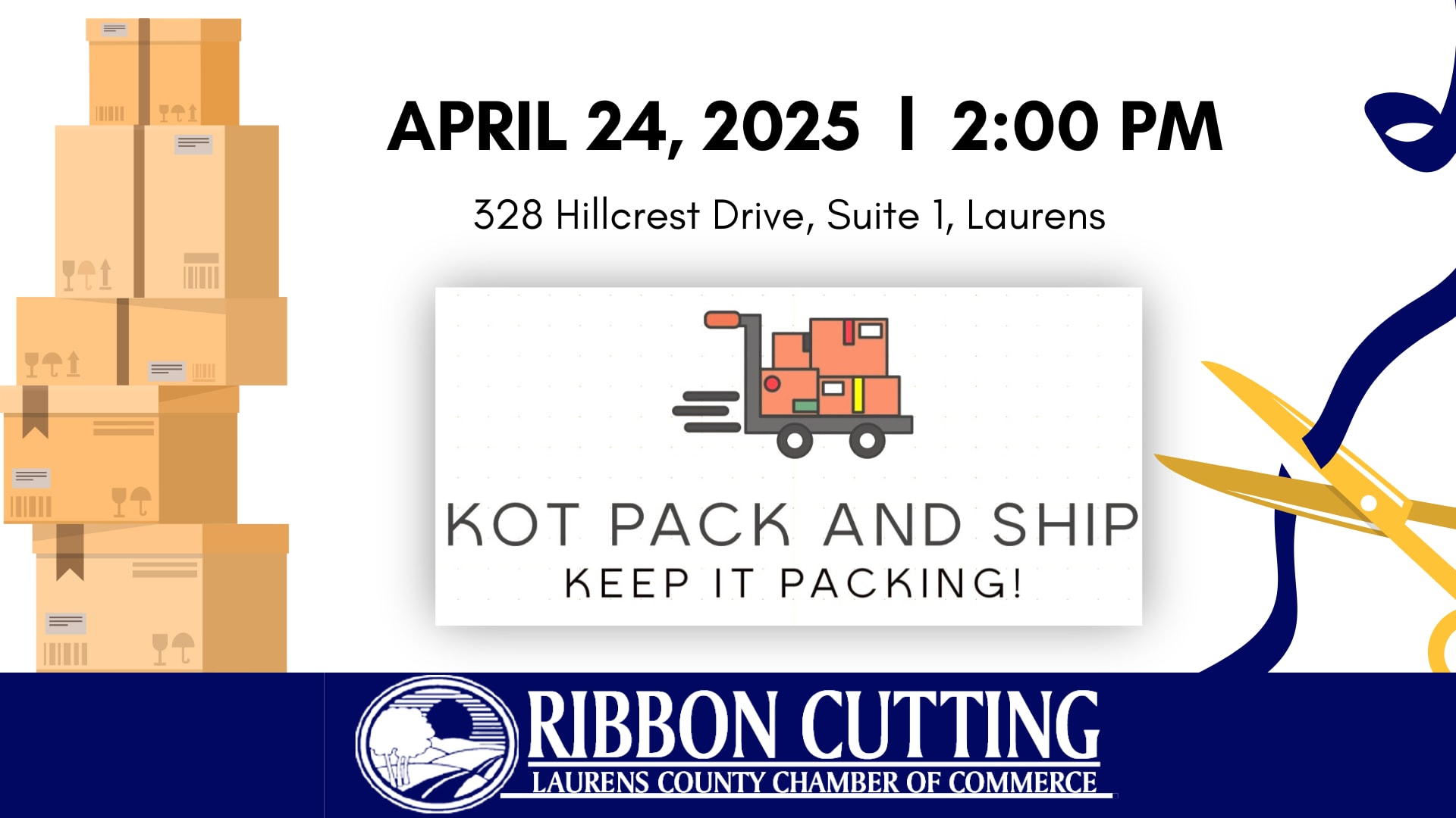 Join us in welcoming KOT Pack and Ship to Laurens County! Conveniently located at 328 Hillcrest Drive, Suite 1, in Laurens, this new business provides package drop-off and shipping services, print and copy solutions, and will soon offer both physical and virtual mailboxes!