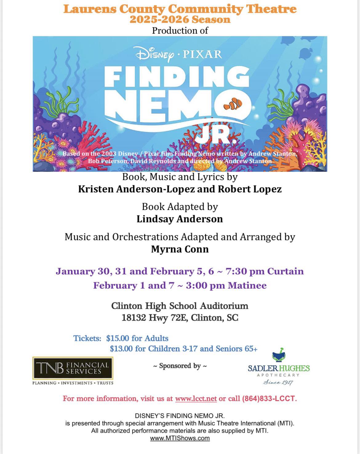 Dive into an unforgettable family-friendly adventure with Laurens County Community Theatre’s production of Finding Nemo Jr. Featuring colorful characters, catchy songs, and heartwarming moments, this fun-filled musical is perfect for all ages. Performances take place at Clinton High School Auditorium on select dates.