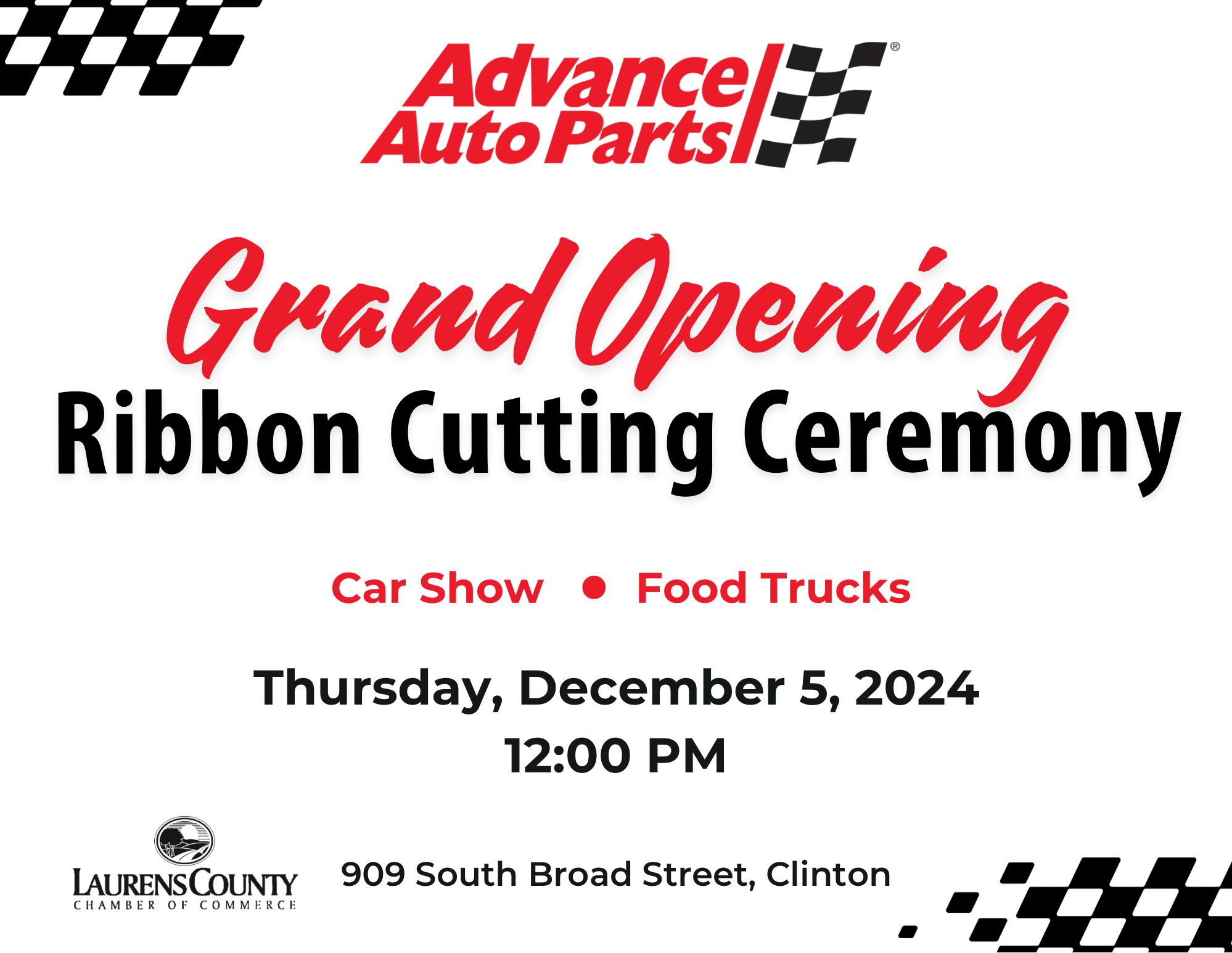 Join us for the grand opening ribbon cutting celebration for Advanced Auto Parts in Clinton! Following the ribbon cutting at noon, attendees are invited to stick around for a car show and food trucks!