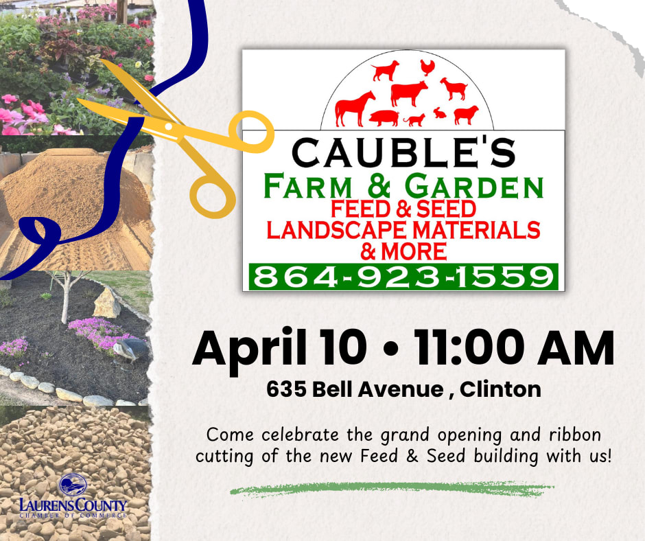 Join us for the grand opening and ribbon cutting of the new Feed & Seed building at Cauble's Farm & Garden!