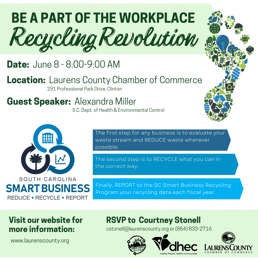 The Laurens County Chamber of Commerce and Keep Laurens County Beautiful are excited to partner with S.C. Dept. of Health & Environmental Control for the Smart Business Workshop on June 8th. This workshop will focus on the South Carolina Smart Business Program . We look forward to hearing from guest speaker, Alex Miller from the SC DHEC Office of Solid Waste Reduction & Recycling. The workshop will cover how to implement recycling practices in your workplace and how it can benefit your business.