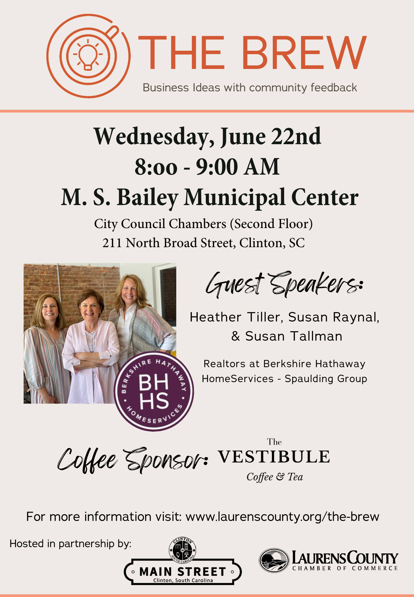 In partnership with Main Street Clinton, we will enjoy a morning of coffee and conversation at our next gathering of "The Brew", on June 22nd at the City of Clinton Council Chambers from 8:00-9:00 AM. Coffee will be provided by The Vestibule. The event will begin with a presentation by local entrepreneurs Heather Tiller, Susan Raynal, and Susan Tallman with Berkshire Hathaway Homeservices. They will end the presentation with 3-4 questions for the audience relating to topics that will help them accomplish their business goals. The audience will then participate in Q&A and feedback to help and support the presenting entrepreneur. Afterwards, attendees are encouraged to use the remaining time to network! More information about The Brew can be found under the “Chamber Events” tab on our website, www.laurenscounty.org, or on our Facebook event.