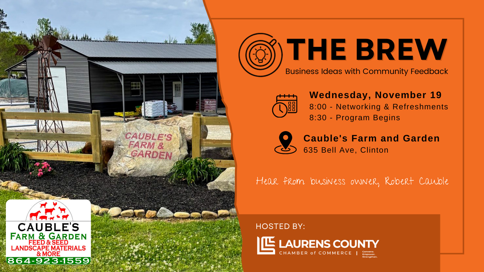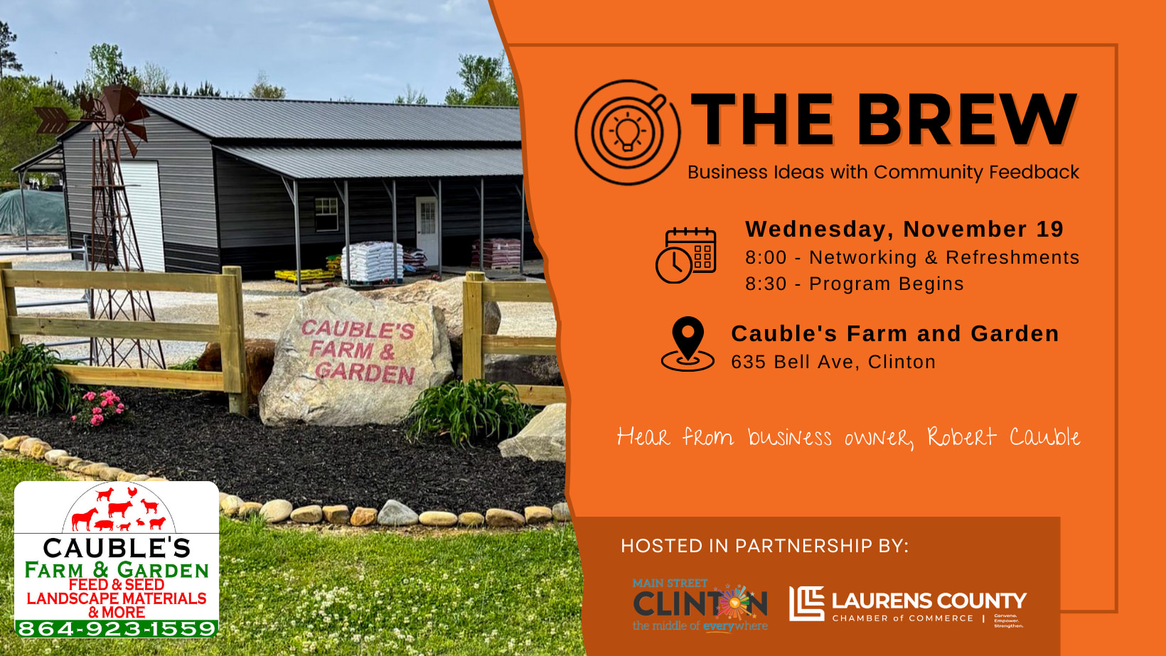 Join us at Cauble’s Farm & Garden located at 635 Bell Avenue in Clinton, on Wednesday, November 19th, to hear from business owner Robert Cauble. The Brew Laurens County gatherings occur bi-monthly, offering local entrepreneurs an exclusive opportunity to gain insights and guidance from the community and fellow business owners.Images