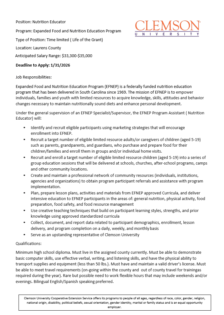 Under the general supervision of an EFNEP Specialist/Supervisor, the EFNEP Program Assistant ( Nutrition Educator) will: